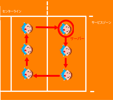 サーブ権ごと、右回りに決められたポジションにチェンジをしなければならない。